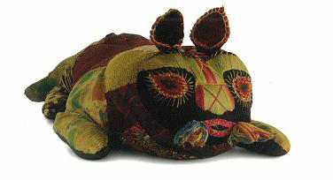 엄마는 사랑스런 아기에게 용감하고도 친근한 호랑이 모양으로 베개를 정성들여 만들고 관습대로 좁쌀을 넣어 베어 주었을 것이다. 분명 사내아이였을 베개주인의 아명은 '범이' 정도가 됐을까? 한국의 호랑이는 참으로 다양한 모습을 띠고 있지만, 이렇게 천진난만한 어린아기에게 맞춰진 색동조각 바느질의 호랑이는 처음 보았다. 호랑이 얼굴 또한 잠든 아기얼굴처럼 마냥 천진한 것이었다.