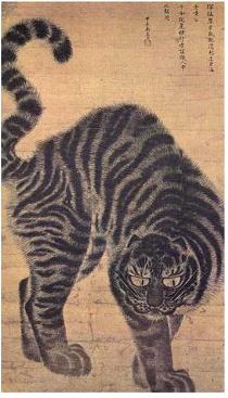 | ▲ 전 심사정의 호랑이. 서울국립중앙박물관소장. 코벨은 맹수로서 호랑이를 그린 가장 사실적 걸작품으로, 눈에 나타난 야수성과 자연스런 포즈 등은 실제로 호랑이를 본 화가의 솜씨라고 해설했다. |