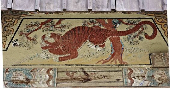 지난 한 해 200여장이 넘는 코벨박사의 호랑이 글을 다시 꺼내 보면서 그가 언급한 호랑이 그림들만이라도 원본을 확인해 보고 싶었다. 그래서 김천 직지사로 산신도의 호랑이를 보러갔더니 이미 원본은 치워지고 그 자리에는 조그만 사진 패널 한 개가 달랑 대웅전 구석에 걸려 있었다.