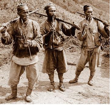 | ▲ 한국의 옛사진에서 본 포수들- 호랑이 포수들인지는 모르겠으나 옷차림에는 호주머니가 많이 있고 모두 총과 담뱃대를 들었다. 다부진 체격에 차분하고 날렵해 보이는 남성들이다 |