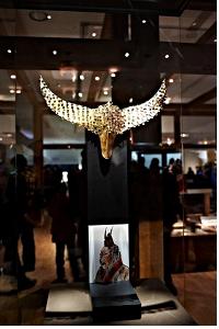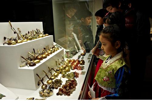 | 2011년 경주박물관 특별전에서 황남대총 남분 출토 금으로 된 왕비의 말갖춤 유물을 보는 관람객들. c 이순희 |