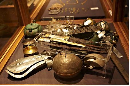 | 황남대총 남분출토 왕의 유물인 금동고리 자루 칼들. 칼은 금동으로 된것부터 작은 칼이 덧붙은 것, 쇠로 된 것, 왕비의 칼 등 셀수 없이 많았다. 백자루는 본 것 같다. c 이순희 |