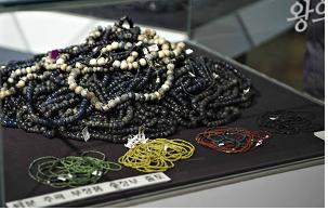 | 왕의 유물인 파란 구슬은 서리서리 몇무더기나 고여있다. 그 앞의 빨갛고 검고 노랗고 푸른색 나는 구슬은 깨알만한 것들이다. c 이순희 |