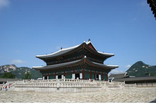 동쪽에 일화문을, 서쪽에 월화문을 거느리며 회랑으로 둘러쳐진 근정문을 들어서니 조선의 법궁(法宮)인 경복궁의 정전(正殿)이 이중월대(二重月臺) 위에 당당하게 위용을 자랑하며 우뚝 서 있습니다. 근정전 앞 넓은 뜰에는 삼도(三道)의 양 옆으로 품계석(品階石)이 일렬로 늘어서 있고 그 주위로는 다듬지 않은 돌인 박석(薄石)이 깔려 있는데 가공하지 않은 박석을 사용한 것은 햇빛의 반사를 막고 미끄러짐을 방지하기 위해섭니다.