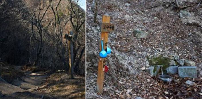 | ▲ 왼쪽 사진은 '요내정에 대한 또 하나의 주장', 포수 우물로 가는 길이다. 좁은 길이고 산비탈이 이어진다. 오른쪽 사진은 포수 우물의 2013년 12월 모습이다. 최민희는 이곳이 석탈해가 마신 요내정이었다고 추측한다. 수량은 감로수보다 적으나, 가뭄에도 마르지 않고 나온다. 지금의 헬리포트에서 200m가량 떨어져 있다. 경주시내로 흐르는 알천의 발원지이다. ⓒ이순희 |
