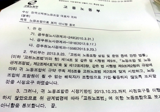 | ▲ 고용노동부가 24일 전교조에 보낸 '팩스' ⓒ전교조 홈페이지 |