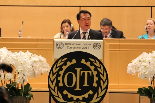| ▲ 방하남 고용부장관은 (현지시각 2013년 6월12일 12시) 제102차 ILO총회에서 기조연설을 하고 있다. 방 장관은 '전교조 법외노조 통보'를 하지 말라는 ILO의 권고를 무시하고 24일 전교조에 '노조 아님' 통보를 했다. ⓒ고용노동부 |