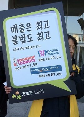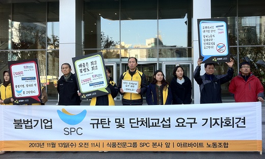 아르바이트 노동조합(알바 노조)는 13일 서울 서초구 양재동 SPC그룹 본사 앞에서 이 같은 기자회견을 열고, 프랜차이즈 가운데 배스킨라빈스, 던킨도너츠, 파리바게뜨를 합쳐 법 위반 건수 1위를 차지한 SPC그룹에 단체교섭을 요청하겠다고 밝혔다.