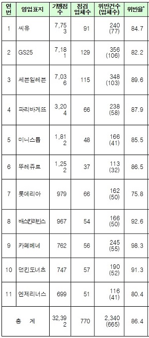 업체별로 보면 카페베네가 98.3%로 법 위반 1위를 차지했고, 2위가 배스킨라빈스(92.6%), 3위 던킨도너츠(91.3%), 4위 세븐일레븐(89.6%), 5위 파리바게뜨(87.9%)였다. 5위 안에 SPC 계열사가 3곳이나 포함됐으며, 세 계열사를 합치면 SPC의 위반 사례가 1위다. 그 뒤를 6위 뚜레쥬르(86.5%), 7위 미니스톱(85.5%), 8위 씨유(84.7%), 9위 GS25(82.2%), 10위 엔제리너스(80.4%), 11위 롯데리아(75.8%)가 이었다.