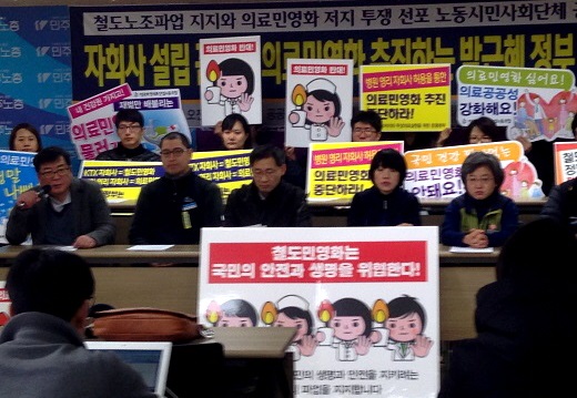 무상의료 운동본부는 "박근혜 정부의 이번 '보건의료 투자 대책'은 이전 정부가 취한 어떤 의료 민영화보다 더 전면적이고 노골적인 의료 민영화 방침"이라며 "철도 이용료와 의료비를 폭등시키고 국민의 생명을 위협하는 박근혜 정부의 노동자 탄압이야말로 불법적이고 정당성이 없다"고 주장했다.