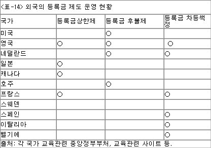 | "고질적인 등록금 인상, 해결 방법 얼마든지 있다" 참여연대는 "매년 반복되고 있는 고질적인 등록금 문제를 해결하기 위해서는 반드시 제도적 개선이 이루어져야 한다"며 외국 사례에 비춰볼 때 등록금 문제를 완화할 수 있는 다양한 제도가 있다고 강조했다. 외국 대학 등록금 관련 정책은 등록금을 보전해주는 제도와 등록금 부담을 줄여주는 제도로 나눌 수 있다. 등록금 보전은 장학금 지원 정책으로 무상교육, 생활비 지급 등을 포함한다. 등록금 부담을 줄여주는 정책은 등록금 상한제, 등록금 후불제, 등록금 차등 부과제로 구분할 수 있다. 등록금 상한제는 등록금 인상률에 일정한 가이드라인을 두는 제도이다. 등록금의 폭등을 통제할 수 있을 뿐 아니라, 물가상승률을 감안한다면 등록금 동결의 효과를 가질 수 있다. 등록금 후불제는 우리나라의 정부 보증 학자금 대출과 비슷하다. 그러나 대부분의 국가는 졸업 후 일정 기간 이후부터 이자와 원금을 상환하게 하거나 일정 수준의 소득이 있어야 상환하게 하는 제도로 운영되고 있다. 등록금 차등 부과제는 학생이나 가정의 소득 수준에 따라 등록금을 차등 책정하는 제도이다.