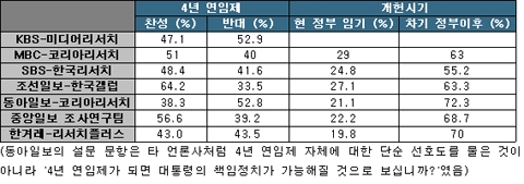 노 대통령이 대국민담화를 발표한 9일 각 방송사와 주요 신문사들은 긴급 여론조사를 실시해 9일 방송과 10일 조간신문을 통해 발표했다. 언론사 별로 설문조사 내용과 수치에 조금씩 차이를 보였지만 모두 '4년 연임제 일리 있음-노 대통령 임기 내 개헌 반대'의 틀을 벗어나지 못했다.