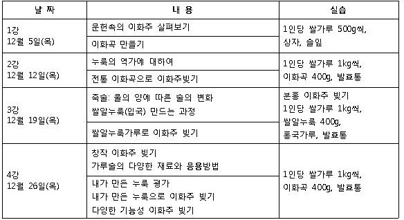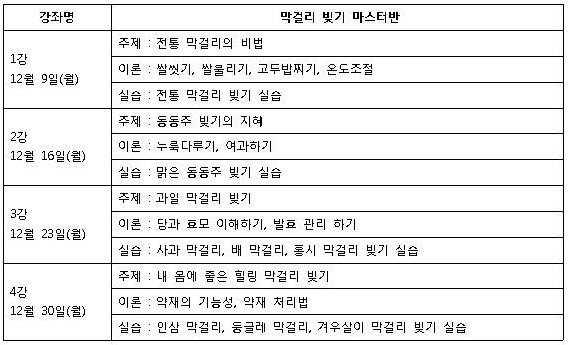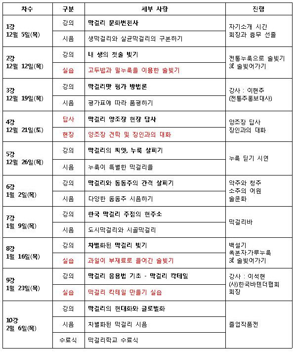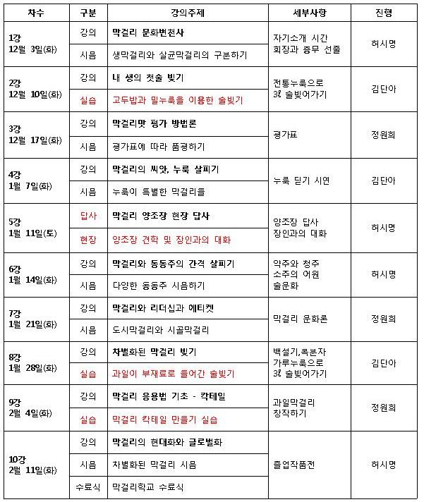 * 술빚기 실습 2회, 막걸리 칵테일실습 1회, 현장답사 1회 (막걸리 시음 1회에 평균 5종류 시음)
