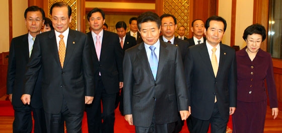 비장하기는 우리당 지도부도 마찬가지였다. 정세균 당 의장은 "비감한 생각이 든다"며 "대통령의 당적정리에 이런저런 생각이 있으나 대통령의 결단을 존중할 수밖에 없음을 안타깝게 생각한다"고 말했다.