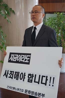 ▲지난달 16일 이성주 언론노조 MBC 본부 위원장의 1인 시위 모습. ⓒ언론노조 MBC 본부