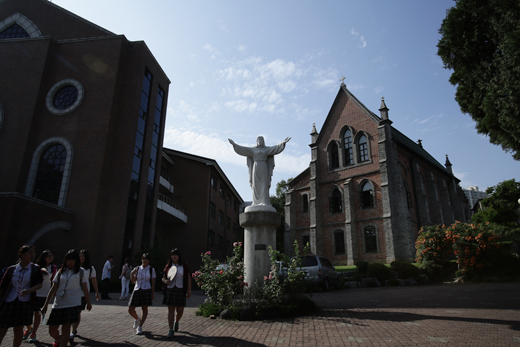 성심여고에서 빼놓을 수 없는 또 하나의 자랑거리는 바로 아름다운 교정이다. 너른 터에 반듯하게 자리한 학교 건물과 성당, 그리고 수녀상. 그 사이사이에는 꽃나무들이 정갈하게 배치돼있다. 수풀이 우거진 뒷마당은 이 학교 구성원들의 점심 산책로다.
