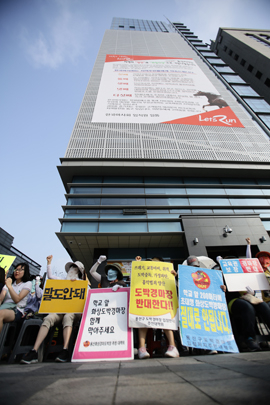 가을 개장까지 불과 5개월을 앞두고서야 건물 용도를 알게 된 주민들은 당혹감을 감출 수 없었다. 전방 200~500미터 사이에 위치한 학교만 대여섯 곳이기 때문이다. 교육 환경의 질 저하를 우려한 주민들과 해당 학교 교사들이 급하게 입점 저지를 위한 대책위원회를 꾸렸다. 그리고 지난 1월부터는 건물 앞에서 천막 농성을 시작했다.