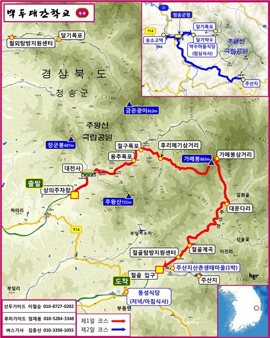 <백두대간걸작선> 제44강 <주왕산 구간> 참가비는 22만원입니다(왕복 교통비, 1일 숙박비, 4회 식사 겸 뒤풀이, 1회 간식, 가이드비, 관람료, 운영비 등 포함). 버스 좌석은 참가 접수순으로 지정해드립니다. 참가신청과 문의는 백두대간학교 홈피 www.huschool.com 전화 050-5609-5609 이메일 master@huschool.com을 이용해주십시오(회원 아니신 분은 회원 가입을 먼저 해주십시오. ☞회원가입 바로가기 ). 산행에 관한 문의는 이철승 교장선생님에게 해주세요(010-8727-0202). 아울러 백두대간학교 카페 http://cafe.naver.com/baekdudaeganschool에도 꼭 놀러오세요. 백두대간학교는 생활 속의 인문학 체험공동체인 인문학습원(대표 이근성)이 지원합니다.