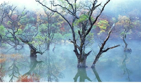 주산지 뽀얗게 피어나는 물안개에 묻어나는