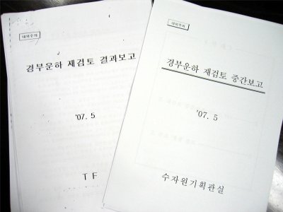 보고서의 제목도 '경부운하 재검토 결과보고(37쪽)'와 '경부운하 재검토 중간보고(9쪽)'로 비슷했고, 문서 표시에 '대외주의'라는 표시가 달려 있는 것도 같았다.