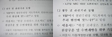 특히 37쪽 보고서에서 "VIP(통상 대통령을 칭하는 표현)께서 열린우리당 지도부와 만찬에서 운하가 우리 현실에 맞느냐고 말씀"이라는 부분은 9쪽 보고서에도 동일하게 포함돼 있다. 글씨체와 문서의 형식도 동일했다.