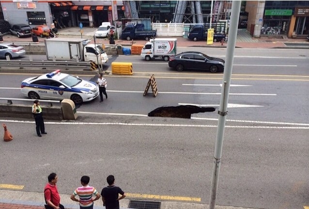 ▲ 지난 8월 5일 서울 송파구 석촌역 인근 도로에서 싱크홀이 나타나, 경찰과 송파구청 등이 긴급 대처에 나섰다. ⓒ프레시안
