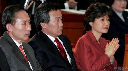 ▲ 지난 3월 국회 헌정기념관에서 열린 한나라당 대선필승대회에 참석한 이명박 후보, 손학규 전 지사, 박근혜 후보. ⓒ연합