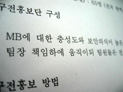 '대외협력위원회' 명의로 된 이 문건에 의하면 이 홍보단은 "MB(이명박 후보)에 대한 충성도와 보안의식이 높은 자로 선별, 팀장 책임 하에 움직이되 팀원들은 전체 실체를 모르는 상태에서 활동"이라고 명시돼 있다. 이명박 후보 캠프 산하의 대외협력위원회의 위원장은 정의화 의원이고 본부장은 정종복 의원이다.