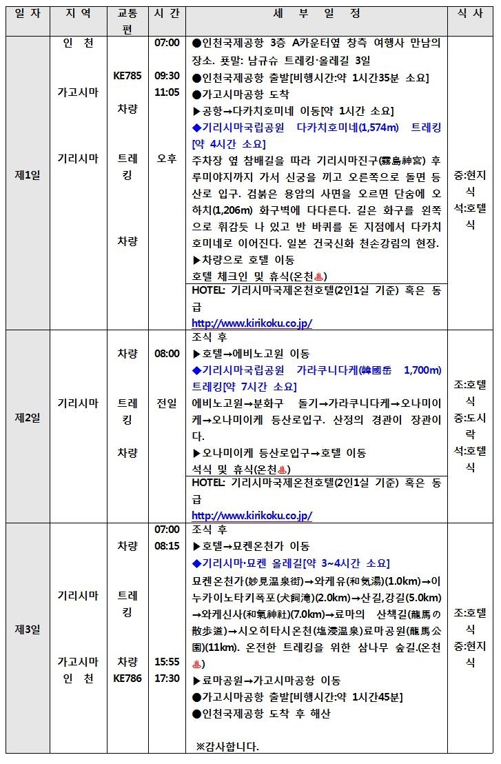 4월 봄맞이 <남규슈 기리시마(霧島) 산림비경 봄꽃트레킹>의 상세 일정은 다음과 같습니다.