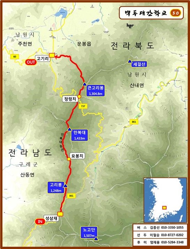 출발 10분전에 도착하여 버스에 탑승하세요. 버스 앞에 <백두대간학교> 표지가 붙어 있습니다. 김종선 기사님 전화번호는 010-3350-1055입니다.