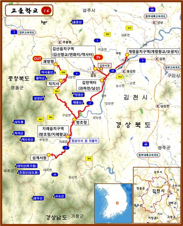 2월 고을학교(교장 최연. 고을연구전문가)는 제16강으로, 삼산이수(三山二水)의 사통팔달이었던 경상북도 김천(金泉)고을을 찾아갑니다. 예부터 김천을 일컬어 ‘삼산이수(三山二水)의 고을’이라 하는데, 세 산은 북쪽으로 황간과 경계를 이루는 황악산(黃嶽山, 1111m), 남쪽으로 성주와 동쪽으로 선산과 경계를 이루는 금오산(金烏山, 977m), 남쪽으로 거창, 서쪽으로 무주고을과 경계를 이루는 대덕산(大德山, 1290m)을 이름이요, 두 내는 대덕산에서 발원한 감천(甘川)과 황악산에서 발원한 직지천(直指川)을 이르는 말입니다.