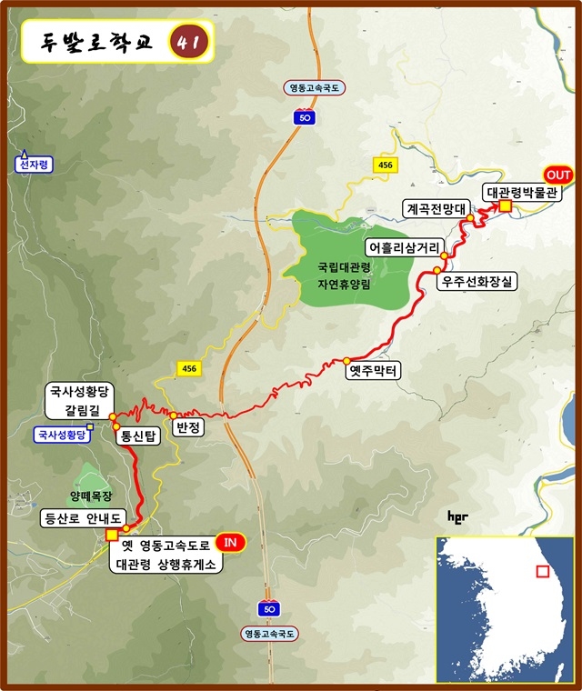 신사임당이 어린 율곡의 손을 잡고 친정어머니를 그리며 걸은 길이고, 율곡의 친구인 송강 정철도 이 길을 걸어 <관동별곡>을 쓰고, 김홍도는 이 길 중턱에서 대관령의 경치에 반해 그림을 그렸던, 유서깊은 옛길입니다.