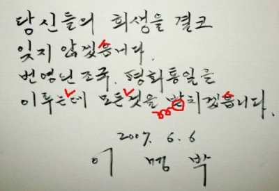 이 씨는 이명박 후보가 지난 6월 국립현충원을 방문해 남긴 방명록 사진을 함께 올려 맞춤법이 틀린 부분을 조목조목 지적하며 이같이 밝혔다.