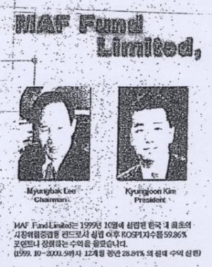 최근에는 MAF 펀드를 독립된 회사로 소개한 별도의 홍보 소책자까지 제시됐다. 이 소책자는 이명박 후보를 '회장'으로, 김경준 씨를 '사장'으로 명시하고 있다. 이명박 후보의 'MAF 펀드 회장설'은또 BBK에 대해서도 "MAF 펀드의 관리와 운용을 맡는다"고 언급하고 있다.