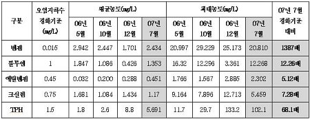 조사결과에 따르면 조사대상 22개 지점 중 정화기준치 대비 최대농도는 발암물질인 벤젠의 경우 1387배(20.810mg/L), 혈관계에 영향을 주는 에틸벤젠은 5.12배(2.302mg/L), 중추신경계통의 기능을 저하시키는 톨루엔과 크실렌은 각각 12.26배(12.268mg/L)와 7.28배(5.459mg/L)가 검출됐다. 암 유발물질인 다환방향족 탄화수소가 들어있는 TPH(석유계총탄화수소)도 68.1배(102.1mg/L)에 이르렀다. 여전히 심각한 오염상태를 보여주고 있다는 얘기다.