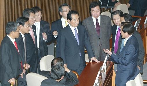 한나라당과 의사일정 합의 없이 이날 임시국회를 소집한 신당은 '직권상정'까지 제기하면서 탄핵소추안 처리 강행을 선언했고, 이에 한나라당도 '물리적 저지 방침'으로 맞서면서 국회는 일촉즉발의 대치를 이어갔다.