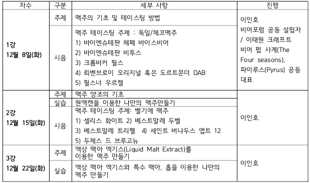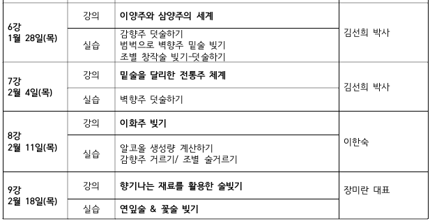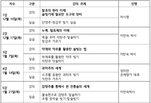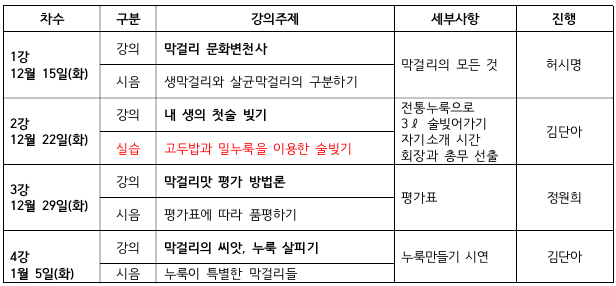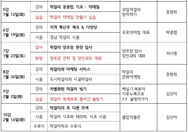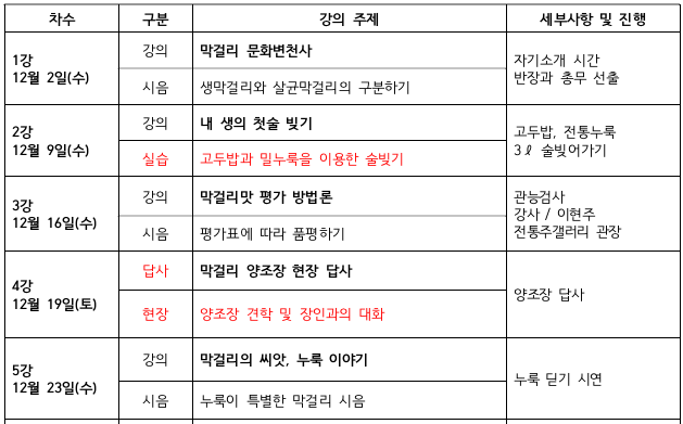 * 술빚기 실습 2회, 막걸리칵테일 실습 1회, 현장답사 1회(막걸리 시음 1회에 평균 5종류 시음)