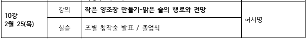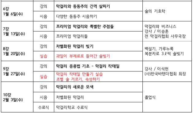 - 강의장소 : 2강,3강,5강은 경복궁 막걸리학교(종로구 삼청로4)
