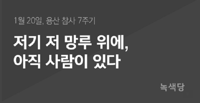 20일은 용산참사 7주기다. '사이다 논평'으로 화제를 모으고 있는 녹색당이 용삼참사 7주기를 맞아 '저기 저 망루 위에, 아직 사람이 있다'는 제목의 논평을 냈다. 당의 상징색인 녹색을 논평에서 빼고 검은 색을 바탕으로 바꿨다.