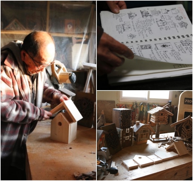 산골 생활이 조금씩 자리 잡아가던 두어 해 뒤부터 집 주위 자주 눈에 띄는 갖가지 새들이 궁금해졌다. 그곳은 1년 절반이 겨울이라고 느껴질 정도로 눈 많고 온도가 많이 내려가는 지역이다. 날씨 탓에 먹이를 못 구해 죽은 작은 새들을 많이 발견하곤 했다. 새를 위해 할 수 있는 일을 생각했다. '새집'이었다. 지난 15년 동안 새집 1500채를 지었다. 집 지으면서 뜯어낸 나무들, 자연에서 주워온 가지들을 재료로 썼다. 새집을 만들어서 갖고 싶어 하는 사람들에게 2~3점씩 집어주기도 하고, 근처 성당이나 학교에 십여 개씩 선물하기도 했다.