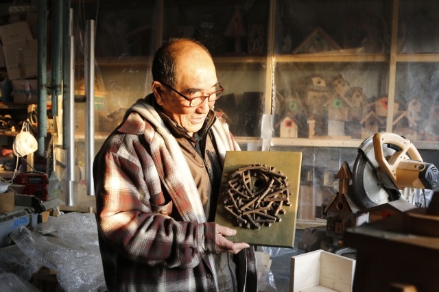 "새집에서 지붕이 가장 중요해요. 지붕 때문에 다른 것이 힘을 받아 흐트러지지 않아요. 지붕은 직사광선이나 비나 눈을 맞게 되니까 천연페인트를 여러 번 칠해주죠. 화학페인트를 쓰면 절대 새들이 들어오지 않아요. 요즘은 계곡을 정비한다고 직선으로 만들어 나무들이 다 씻겨 내려가 버렸어요. 바위에 나무가 걸려서 오래 씻긴 것을 구하기 어려워요. 안타까운 일이죠."