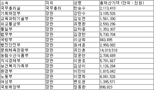 김인종 경호처장과 김중수 경제수석은 각각 25억3600만 원, 20억4000만 원의 재산액을 신고해 그 뒤를 이었다.