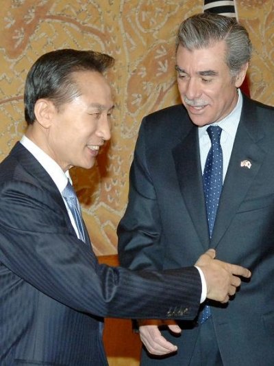 이 대통령은 이 자리에서 "중요할 때 잘 오셨다"며 "지금 한미 FTA 문제 때문에, 요즘 알다시피 한국이 (미국산) 쇠고기를 수입하는 문제, 안전문제에 있어 매우 국민이 걱정하는 일이 많이 생겼다"고 당부했다.