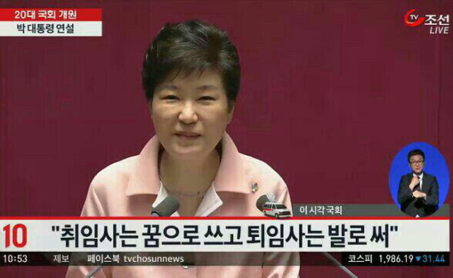조선일보사 계열 종합편성 케이블방송 'TV조선'은 이날 박 대통령의 국회 연설을 생중계로 보도하면서 "취임사는 꿈으로 쓰고 퇴임사는 발로 써"라는 내용의 자막을 내보냈다.