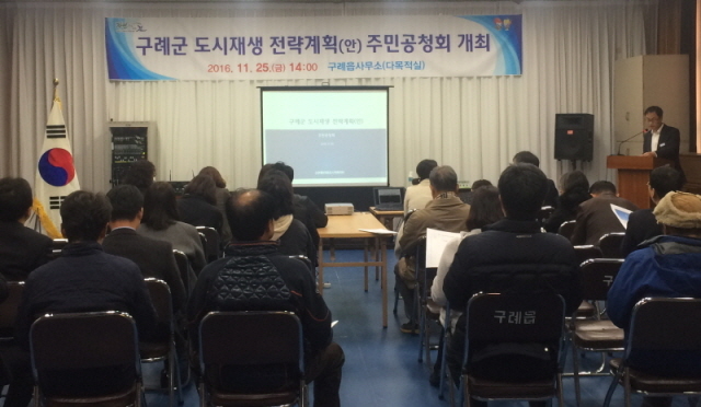 군은 지난 25일 구례읍사무소 다목적실에서 지역주민과 관계전문가 등이 참석한 가운데 도시 재생의 의미와 구례군 도시 특성 및 쇠퇴 진단, 도시 재생 전략 계획 기본구상, 도시재생 활성화를 위한 지역 기본구상(안) 등 도시재생 추진전략을 설명했다.