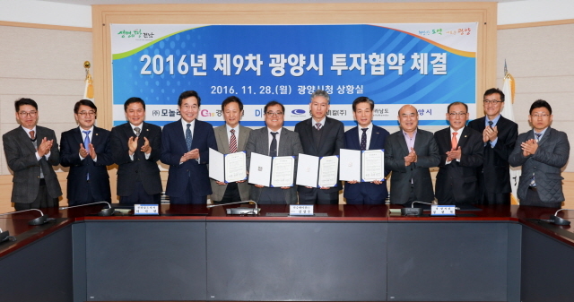시는 28일 시청 상황실에서 정현복 시장을 비롯해 이낙연 전남도지사, ㈜모놀리아 김현모 이사와 경남스틸㈜ 배인호 사장, 디에스알㈜ 이민범 광양공장장, 한승케미칼㈜ 김상수 대표이사 등 50여명이 참석한 가운데 총 948억 원의 투자협약을 체결해 지역민 145명이 일자리를 얻게 됐다.