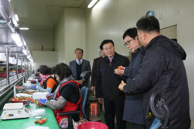 ▲ 지난 28일 송도근(오른쪽 두 번째) 사천시장을 비롯한 곤명농협 관계자와 딸기 생산 농업인 등이 곤명면 봉계리 곤명농협 딸기 공동선별장의 선별, 포장과정을 둘러보고 있다. ⓒ사천시