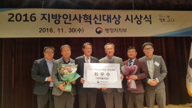 시는 30일 행정자차부 주관으로 정부서울청사 별관에서 열린 2016 지방인사혁신대상 경진대회에서 생산적 공직문화 조성부분 최우수기관으로 선정돼 국무총리상을 수상했다.