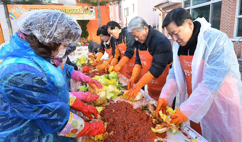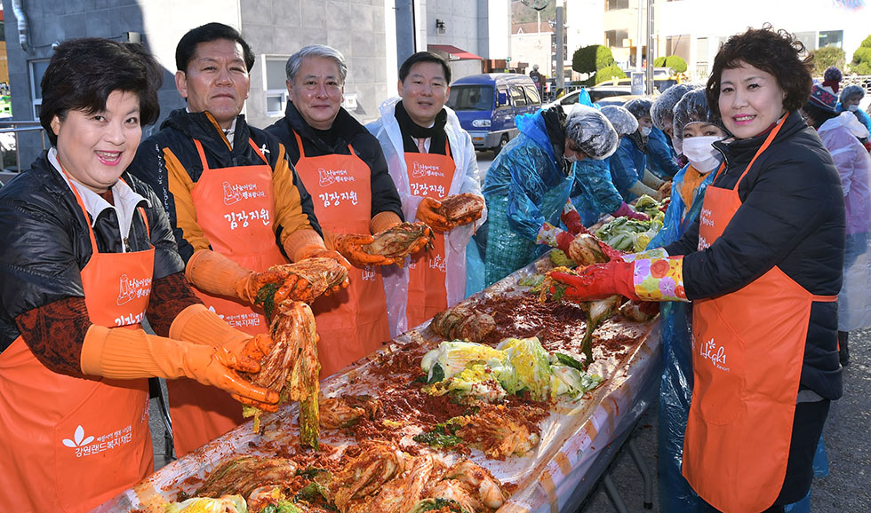 ▲지역출신 이철규 의원, 김양호 삼척시장, 김석준 재경삼척시민회장을 비롯한 재경삼척시민회는 지난 10 삼척시 새마을지회에서 연말 사랑의 김장담그기 행사를 진행하고 있다. 이날 행사는 재경삼척시민회, 새마을지회, 삼척여자공등학교 동문회 등이 합동으로 참여해 담근 2000포기의 김장은 관내 취약계층에 전달할 예정이다. ⓒ삼척시