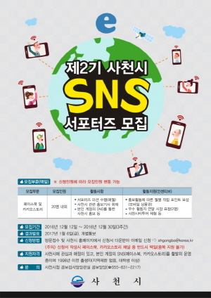경남 사천시(시장 송도근)는 시 도시브랜드 가치 제고를 위한 다양한 콘텐츠를 발굴하고, 시정 주요시책과 축제․문화소식 등 생생한 시정홍보를 함께해 나갈 ‘제2기 SNS서포터즈’를 모집한다고 13일 밝혔다.